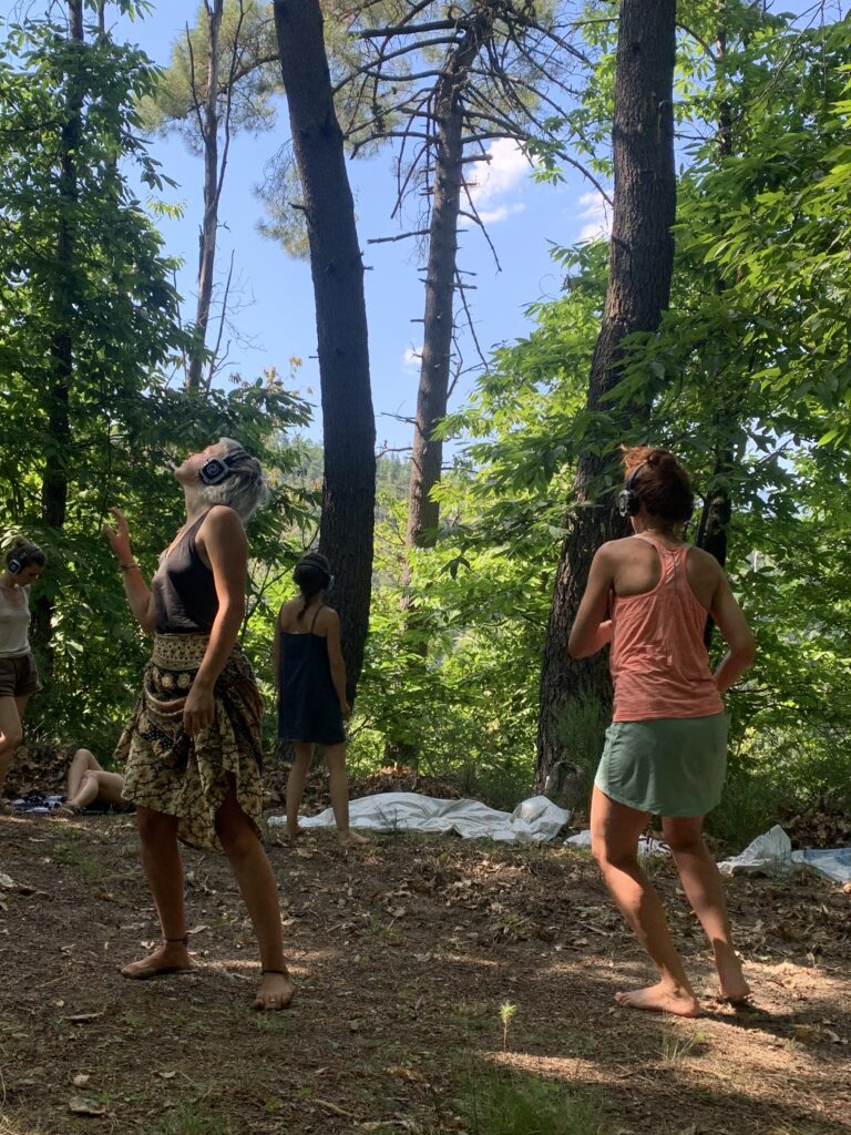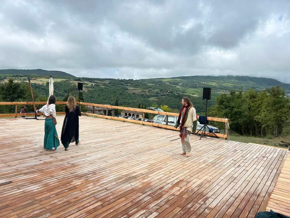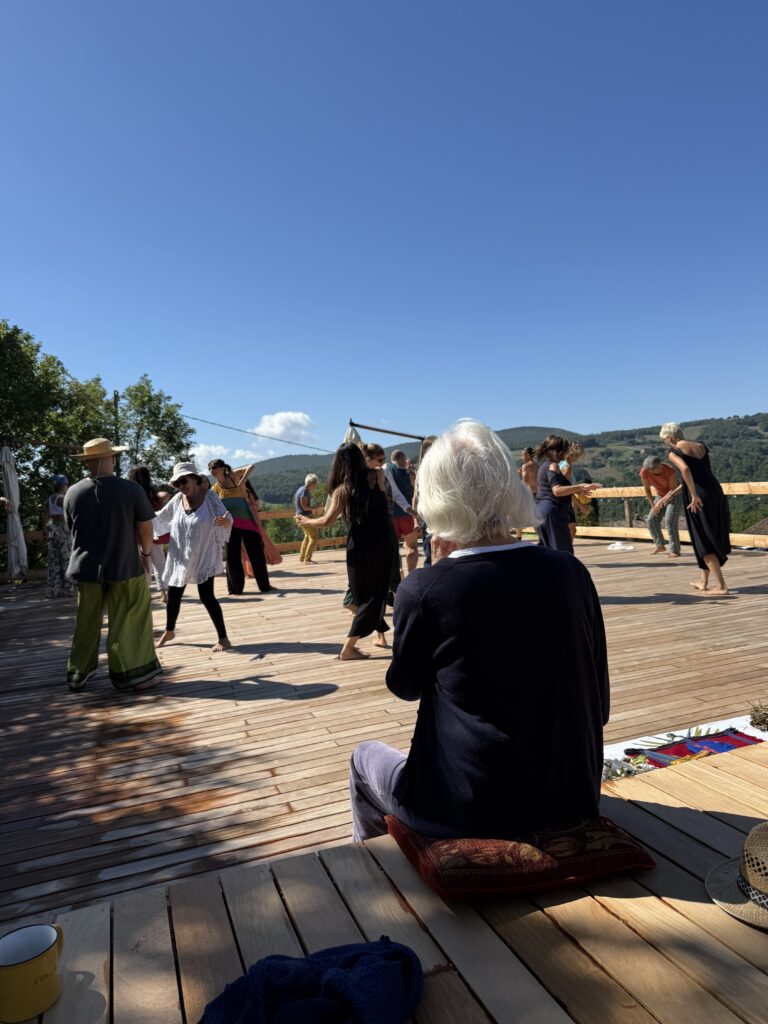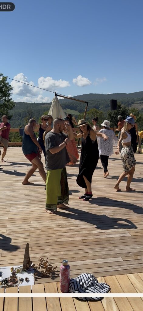 We will dance on the open-air wooden dance floor — a simple and beautiful space where movement meets the landscape — walk through the surrounding hills, and explore movement in nature with wireless headphones (silent disco), allowing music and the elements to guide us.